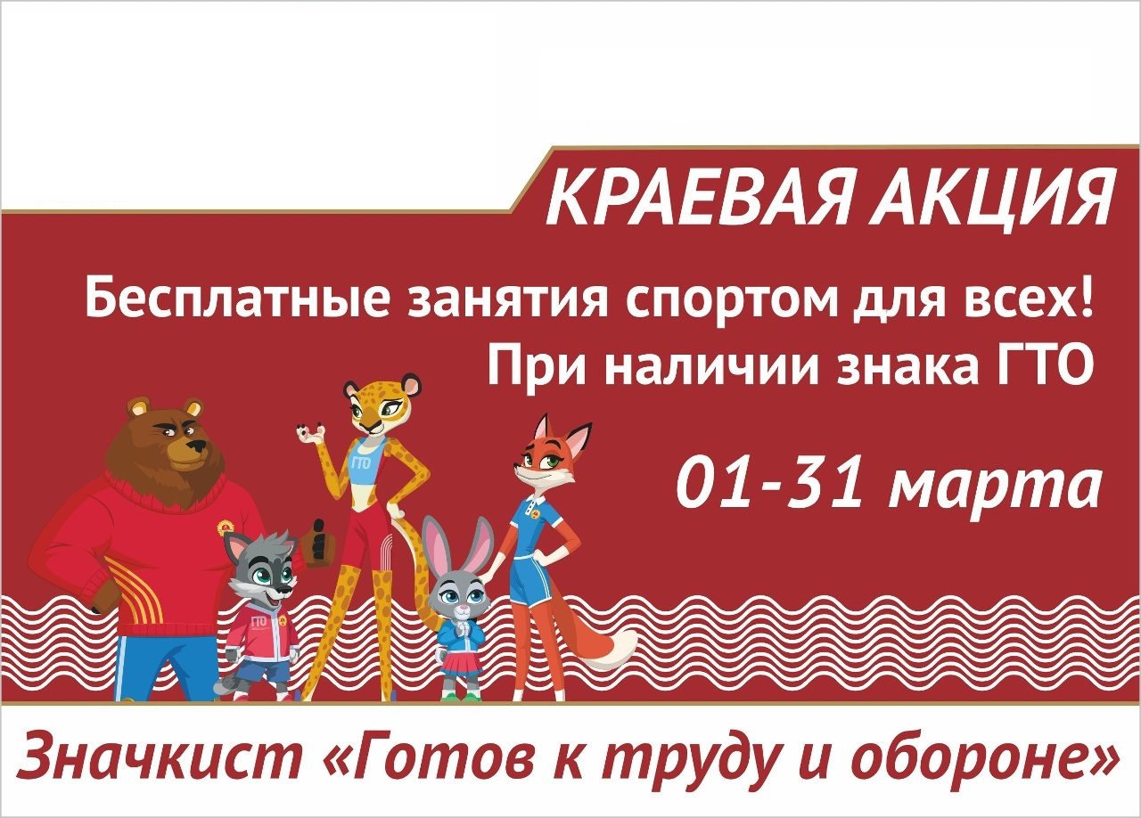 Если у вас есть знак отличия ГТО, эта новость для Вас! Весь март значкистам ГТО Красноярского края для бесплатного посещения открыты бассейны, тренажерные залы и другие спортивные объекты региона.