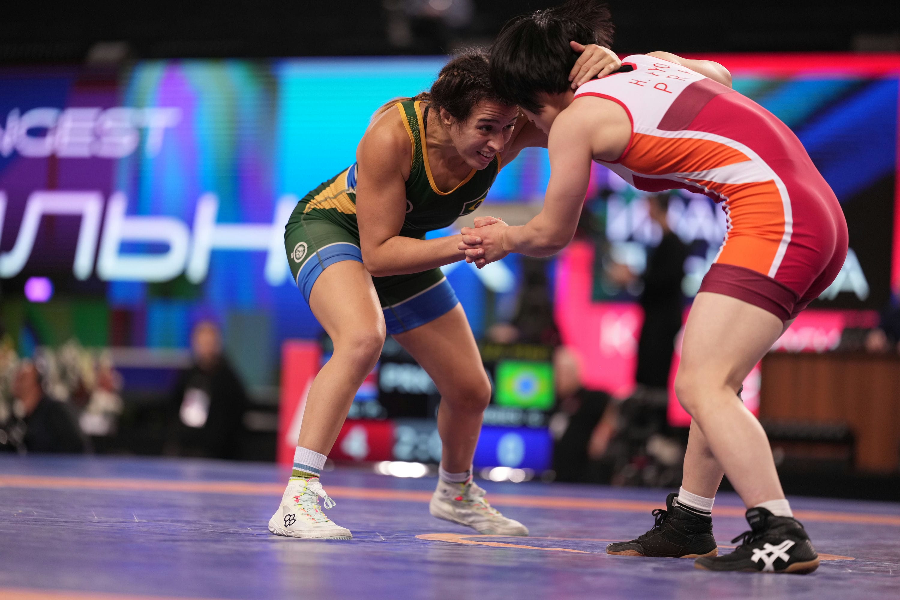 Поединок Александры Скиренко и Лауры Алмаганбетовой из Казахстана (55 кг) проходил в упорной борьбе. В конце первого периода россиянке удалась мощнейшая атака на четыре балла.